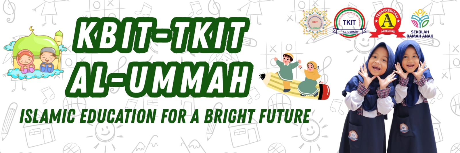 Logo POS KBIT-TKIT AL-UMMAH terdiri dari gambar orang-orang yg berpegangan tangan, buku terbuka, pohon besar dengan daun yang berwarna-warni dan anak-anak yang sedang bermain dibawahnya.